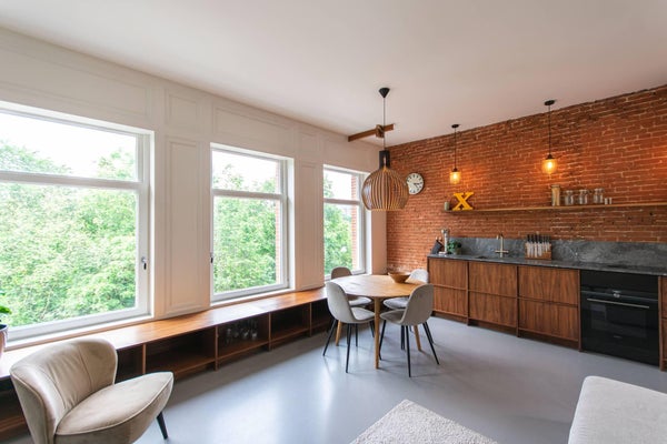 Bij het binnenkomen van het appartement vallen de originele bruine steenwanden langs de trap onmiddellijk op, die naadloos zijn geïntegreerd in het ontwerp van het appartement.