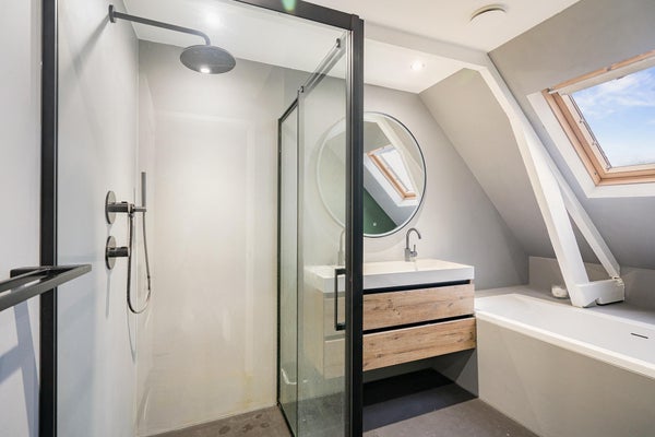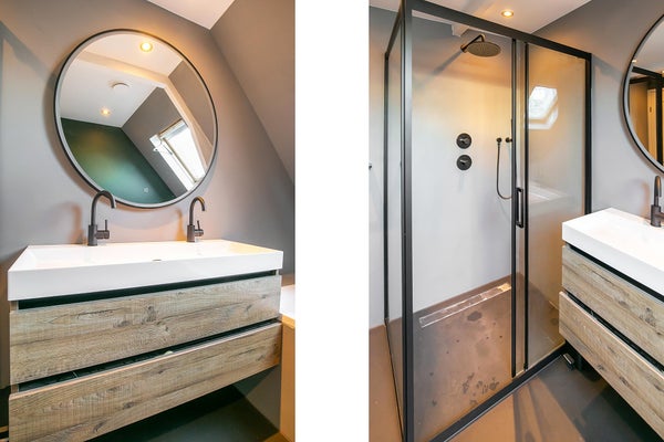 • Badkamer met regendouche, ligbad en dubbele wastafel van 120 cm met 2 kranen