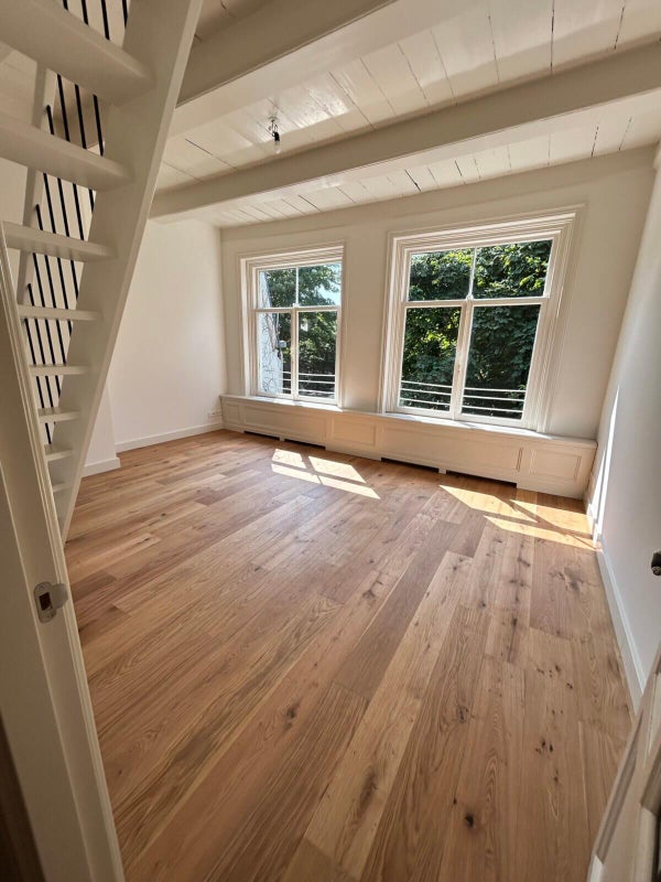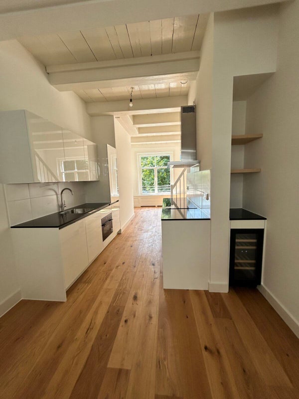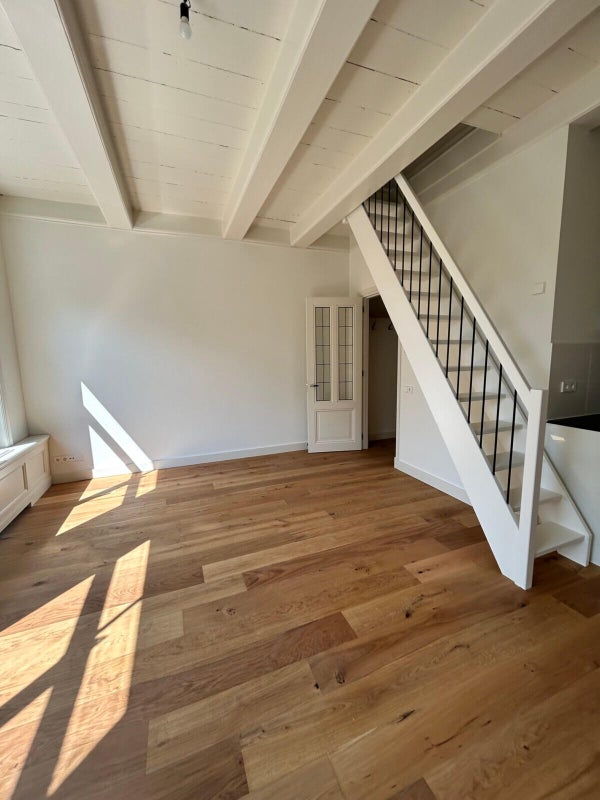 De woning is geheel gerenoveerd! Het appartement bestaat uit 2 woonlagen. Op de begane grond vindt u de ruime woonkamer met open luxe keuken (voorzien van inbouwapparatuur). Verder is er een toilet een ruimte voor de wasmachine/droger. Boven zijn er 2 ruime slaapkamers en een badkamer met douche en wastafel. Er grenst een dakterras aan een van de slaapkamers. De gehele woning is voorzien van een eiken houten vloer.