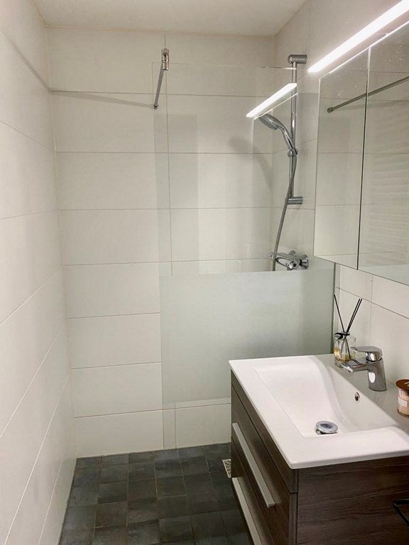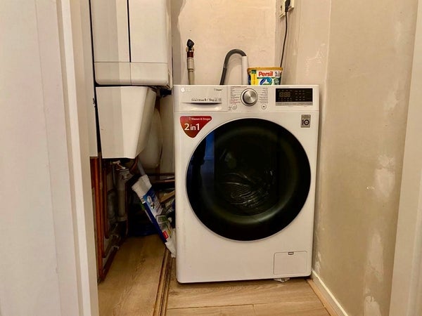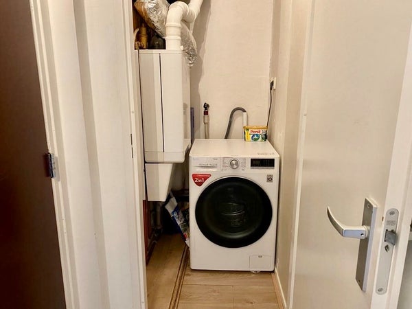 Hal met intercom. Bergkast met wasmachine/ droger combinatie. Badkamer met inloopdouche, wastafelmeubel, handdoeken radiator en toilet.