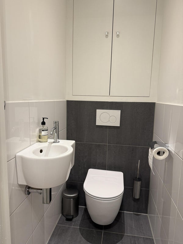 In het midden van de woning ligt de moderne, ruime badkamer, uitgerust met alle gemakken. Aan de voorzijde bevindt zich de royale woonkamer met open keuken. Dankzij de grote ramen is dit een bijzonder lichte en fijne leefruimte. De open keuken is compleet ingericht en biedt volop mogelijkheden voor kookliefhebbers.