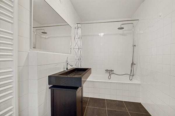 Tweede slaapkamer en moderne badkamer met ligbad en wastafel.