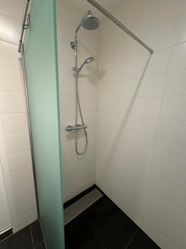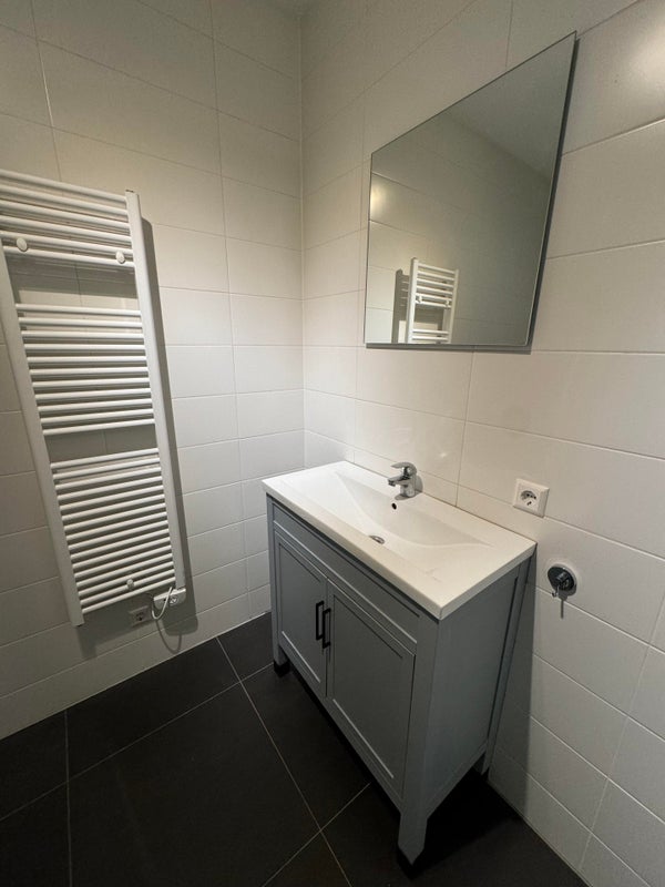 - Moderne badkamer met inloopdouche, wastafel en designradiator;