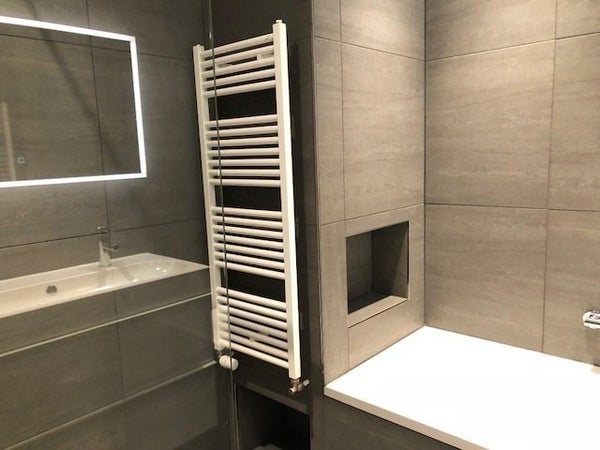 De badkamer is zeer fraai en heeft een aparte een regendouche, een bad en dubbele wastafel met spiegel.