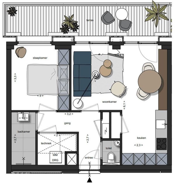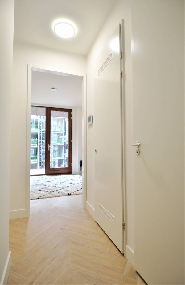 Uiteraard is ook de afwerking van de badkamer strak. De badkamer is voorzien van een inloopdouche en wastafel en is daarnaast volledig betegeld. Het appartement heeft een separaat toilet, welke vanuit de hal te bereiken is. In je appartement heb je een inpandige bergruimte, welke is voorzien van een wasmachine, WPU en WTW-unit.