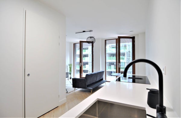 De L-vormige woonkamer, welke aan de stille binnentuin gelegen is, is compleet met de luxe open keuken in hoekopstelling. Daarnaast is de keuken erg praktisch, zo heb je de beschikking over een koelkast met vriesvak, combimagnetron, inductiekookplaat, afzuigkap en vaatwasser.