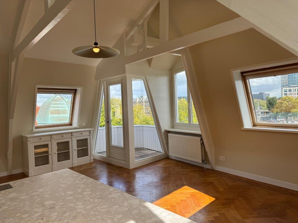 De woonkamer is ruim, elegant en voorzien van hoge ramen die uitkijken over de Amstel – een uitzicht dat elke dag anders is. De visgraatvloer, hoge plafonds en neutrale tinten geven het interieur een moderne en tijdloze uitstraling.