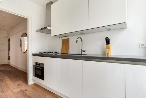De volledig nieuw gerenoveerde keuken is voorzien van diverse inbouwapparatuur, waaronder een koelkast met vriesvak, vaatwasmachine, gaskookplaat, afzuigkap en combi-oven/magnetron, en geeft toegang tot het balkon.