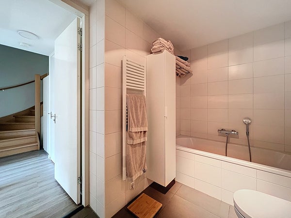 Entree op de begane grond met hal naar de lichte woonkamer met open keuken en schuifpui naar het balkon. De keuken is voorzien van alle moderne inbouwapparatuur. Vanuit de hal toegang tot de trap naar het souterrain met twee ruime slaapkamers en een luxe badkamer met ligbad, inloopdouche en toilet.