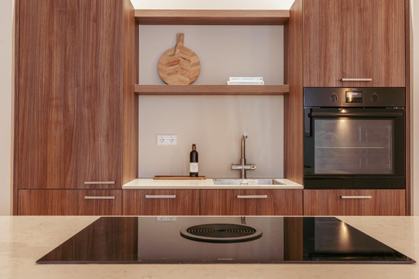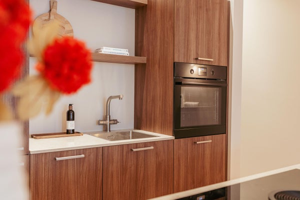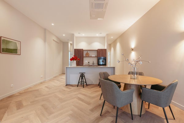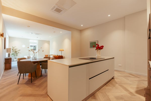 De living is ruim en sfeervol en is afgewerkt met hoogwaardige materialen die passen bij de recente renovatie. De combinatie van een verzorgde vloer, strak stucwerk en airconditioning zorgt voor een comfortabel en stijlvol geheel. De open woonkeuken sluit direct aan op de living en vormt echt het hart van de woning. Het kookeiland en de moderne inbouwapparatuur versterken het gevoel van luxe en functionaliteit.