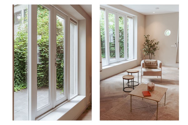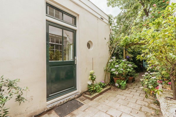 Via een groene privé steeg die uitsluitend toegankelijk is voor bewoners bereikt u de eigen voordeur aan de achterzijde van het pand. In de entree is ruimte voor een royale garderobekast. Zodra u binnenkomt vallen de prettige plafondhoogte en de royale diepte van de woning direct op. Aan de tuinzijde openen dubbele deuren naar de buitenruimte. Deze tuin van ongeveer twaalf vierkante meter ligt op het noordwesten en vormt een heerlijke plek om in de namiddag van de zon te genieten.