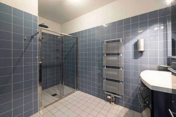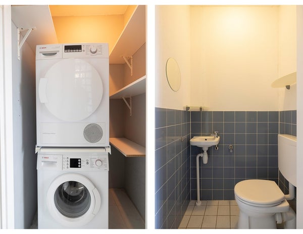 De badkamer is netjes afgewerkt met een douche en wastafel, terwijl het toilet separaat is. In de berging vindt u een wasmachine en droger voor extra gemak.