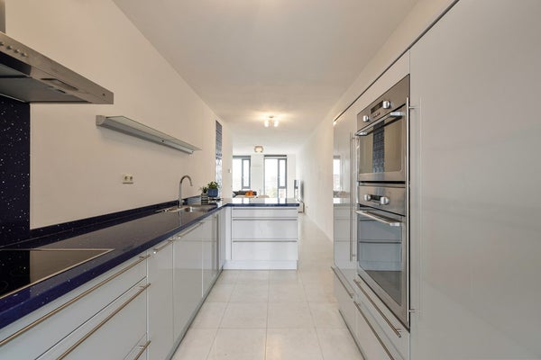 De woonkamer is ruim en goed belicht, met een moderne uitstraling en comfortabele zithoek. De halfopen keuken is volledig uitgerust met hedendaagse inbouwapparatuur, waaronder een 4-pits kookplaat, aparte oven en magnetron, en een vaatwasser – ideaal om direct te koken en te genieten.