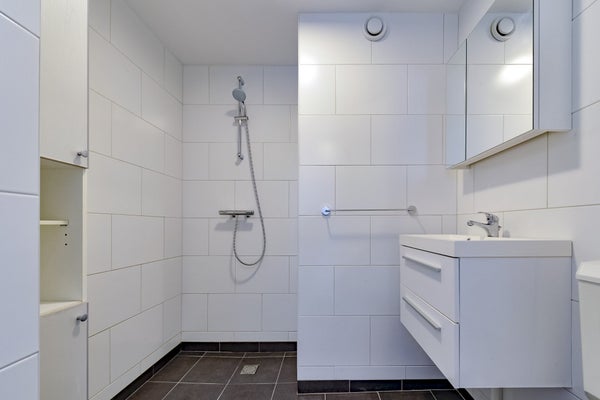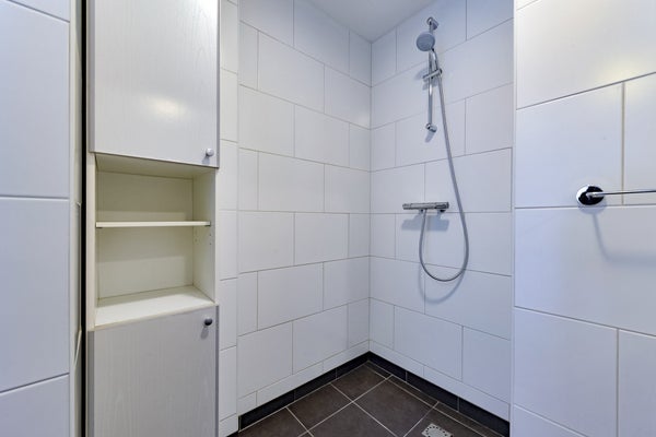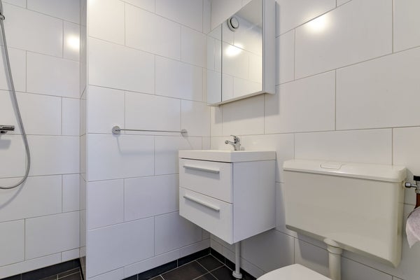 De badkamer is uitgerust met een wastafel, douche en toilet en heeft vloerverwarming. Op de bovenste verdieping van het gebouw bevindt zich een grote zolderkamer van ongeveer 18m2.