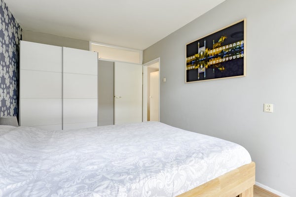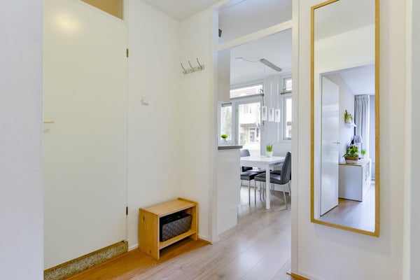 Hal met toegang tot alle kamers. Ruime en lichte woonkamer met balkon (zuid). Grote gesloten keuken gelegen aan de achterzijde. De keuken heeft veel bergruimte en inbouwapparatuur. Een ruime slaapkamer van 12m2, met toegang tot het balkon.