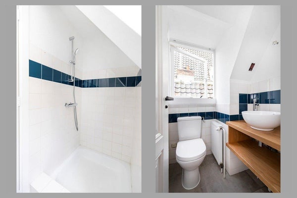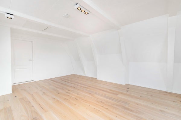 Trap naar de derde etage waar zich twee riante slaapkamers bevinden en een tweede badkamer met toilet, douche en wastafel. Vanuit deze etage is tevens de grote bergzolder over de hele lengte van de woning te bereiken.