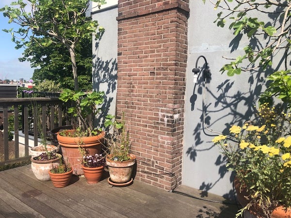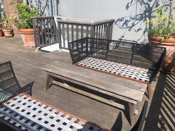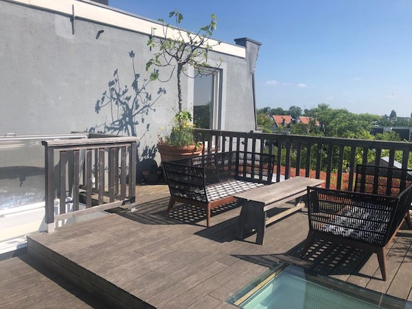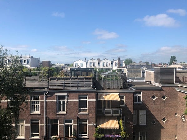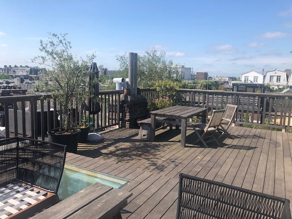 Het fraai aangelegde en zonnige dakterras van ca. 60 m² biedt een panoramisch uitzicht over vrijwel heel Amsterdam – een unieke buitenruimte op deze centrale locatie.