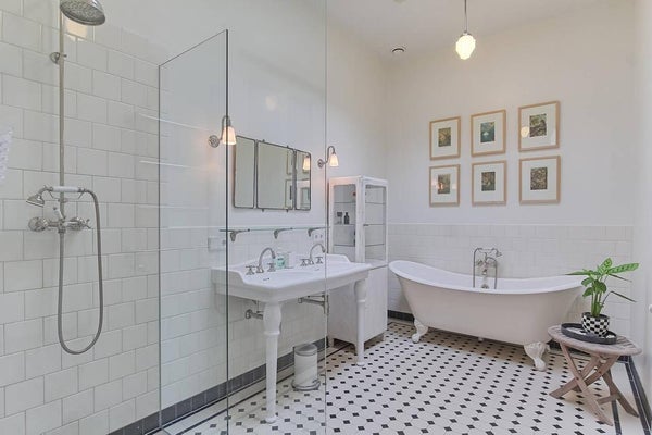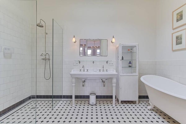 De master bedroom biedt directe toegang tot de elegante badkamer, uitgerust met vrijstaand ligbad op pootjes, inloopdouche, dubbele wastafels, designradiator, mechanische ventilatie, klassieke wit-zwart tegelvloer, skylight voor prachtig daglicht.