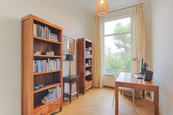 De woonverdieping is voorzien van een stijlvolle visgraat parketvloer, hoge plafonds, sierlijke schouwen, paneeldeuren en originele inbouwkasten. De en-suite kamers zijn smaakvol ingericht en beschikken over designarmaturen en een marmeren schouw.