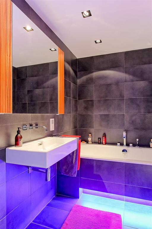 Discreet verlichte trap die leidt naar het lagere niveau van het appartement. Gelegen in de hal is de berging met een hoogwaardige wasmachine en droger, een apart toilet en een badkamer.