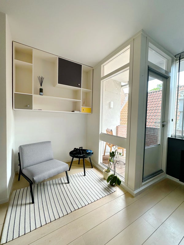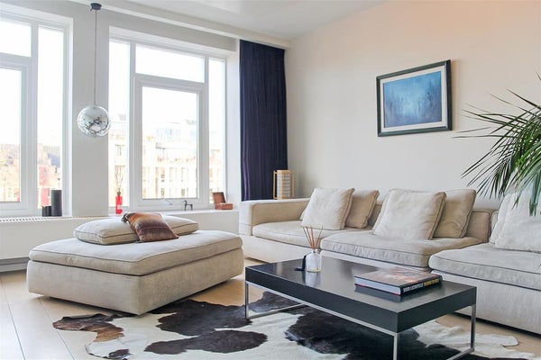 Lichte en heldere woonkamer met twee grote ramen die een prachtig uitzicht op de gracht bieden.