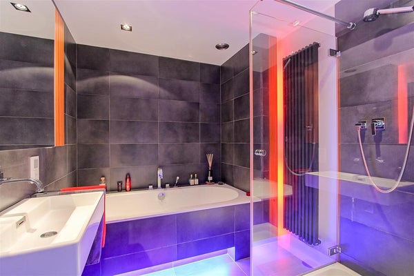 Het toilet en de badkamer zijn luxueus afgewerkt met Dornbracht kranen en Villeroy & Boch douche en badkuip.