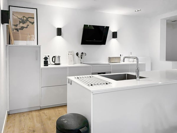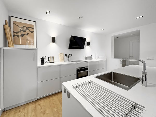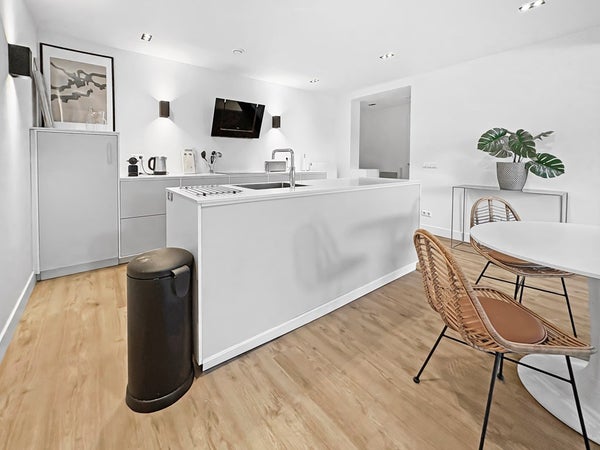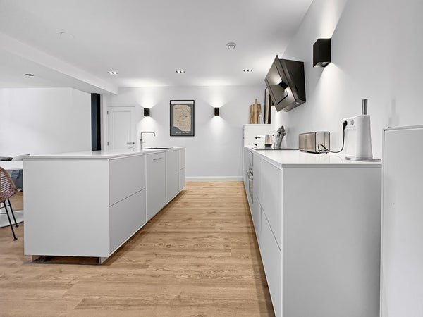 De moderne open keuken sluit naadloos aan op de woonkamer en is uitgerust met alle benodigde inbouwapparatuur.