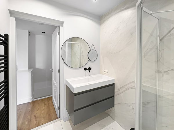 De luxe badkamer is afgewerkt met stijlvolle marmeren tegels en voorzien van een inloopdouche en een modern wastafelmeubel.