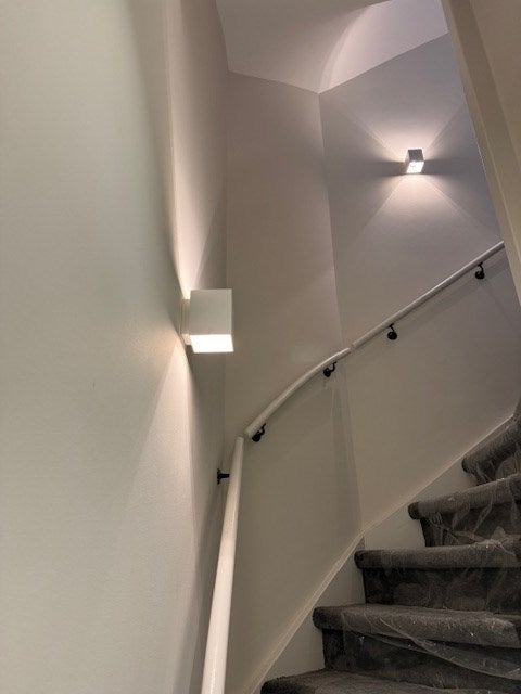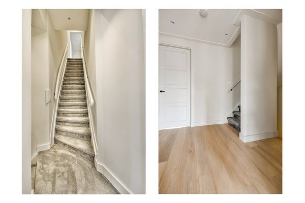 De gestoffeerde trap, uitgevoerd in stijlvol grijs, leidt je naar de tweede verdieping, hier heb je je eigen ingang.