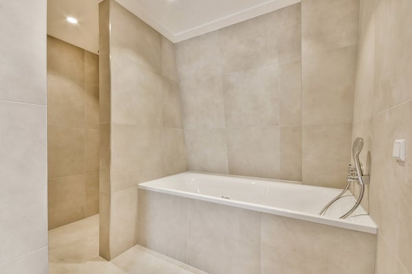 De badkamer heeft een apart bad, inloopdouche en dubbele wastafel met design spiegel. In de hal is een apart toilet en een kamer met de aansluiting voor de wasmachine en droger.