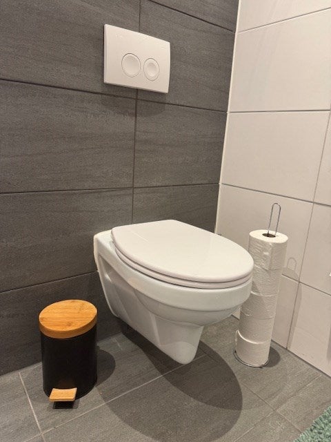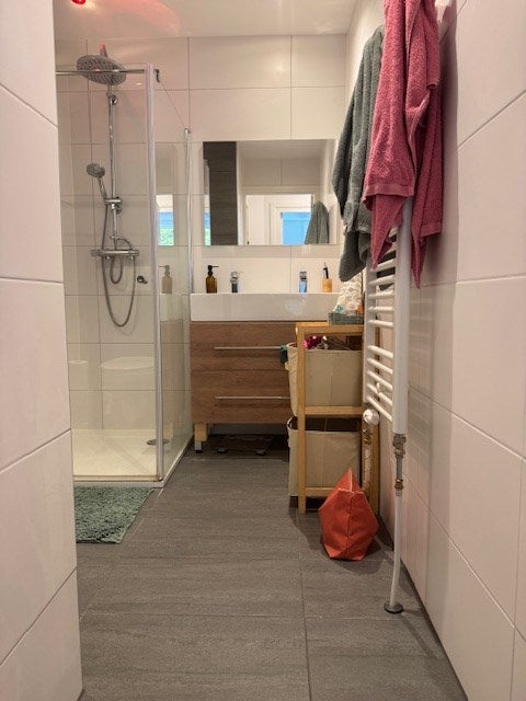 De badkamer is uitgerust met een inloopdouche, handdoekradiator en toilet. Het is gunstig gelegen in het midden van het appartement.