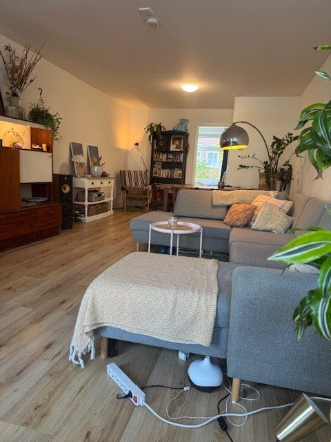 De lichte woonkamer heeft twee grote ramen aan de voorzijde.