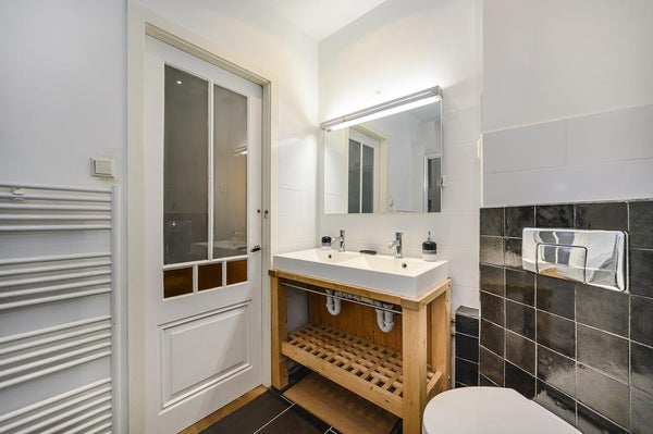De badkamer beschikt over een aparte douche, wastafel en wasmachine voor ultiem gemak.