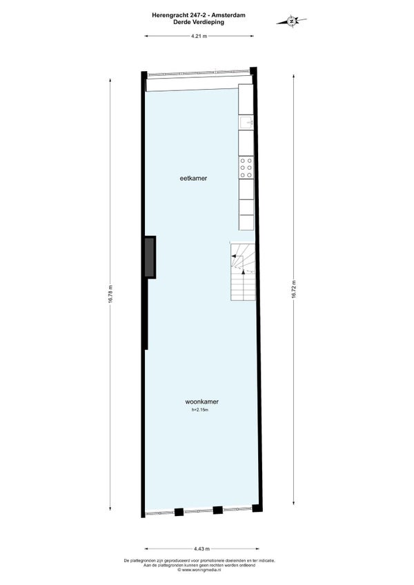 De woonkamer bevindt zich op de derde verdieping. Deze kamer wordt gekenmerkt door de karakteristieke balken en de staafvormige ramen aan de voorgevel. Bijzonder is de grote hoogte aan de grachtzijde van de woonkamer en de hoeveelheid natuurlijk daglicht waarvan u hier kunt genieten. De dakramen hebben elektrisch bedienbare kantelramen. Het appartement heeft drie ramen aan de grachtzijde en vanaf de bank heeft u een prachtig uitzicht over de rijk versierde gebouwen van de Herengracht en de Hartenstraat. De keuken bevindt zich aan de achterzijde van de derde verdieping. Deze is voorzien van diverse inbouwapparatuur, zoals een grote oven met een 5-pits kookplaat en een grote koelkast.
