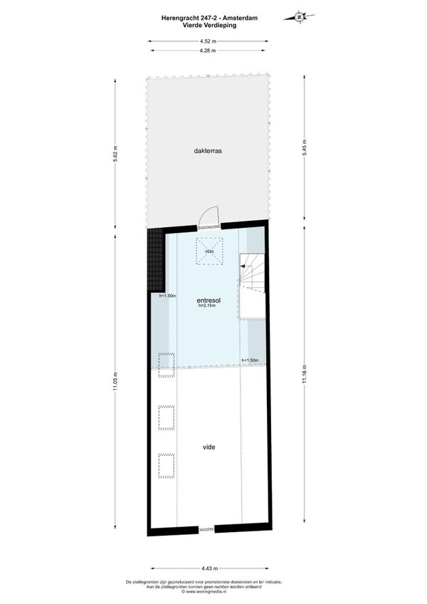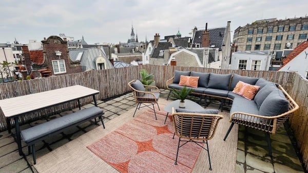 Het werkblad is in totaal ongeveer 3 meter lang en gemaakt van composiet. Er is ook veel opbergruimte. Onder de nok van het dak bevindt zich nog een mezzanine. Deze staat in direct contact met de woonkamer en is ideaal als thuiskantoor. Via deze ruimte heeft u toegang tot het dakterras van ongeveer 25 m2. Hier kunt u bijna de hele dag genieten van de zon en heeft u een prachtig uitzicht over de omliggende daken. Vanaf daar kunt u het Koninklijk Paleis, de Nieuwe Kerk en de Westerkerk zien. Het terras is ook het hoogste van alle terrassen in de buurt, zodat u kunt genieten van uw privacy terwijl u zich in het hart van Amsterdam bevindt.