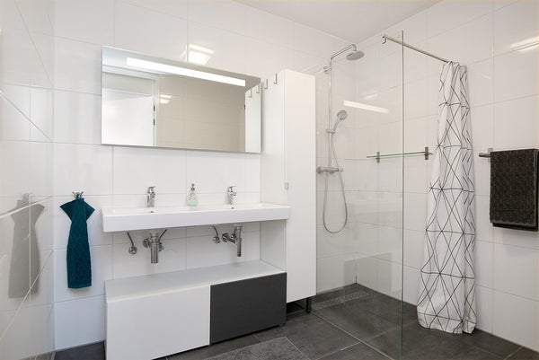 Bij binnenkomst vindt u de master slaapkamer aan de rechterkant en de gastenkamer aan de linkerkant. Verder langs de gang is er een aparte toilet en badkamer ingericht met een dubbele wastafel en een inloopdouche.
