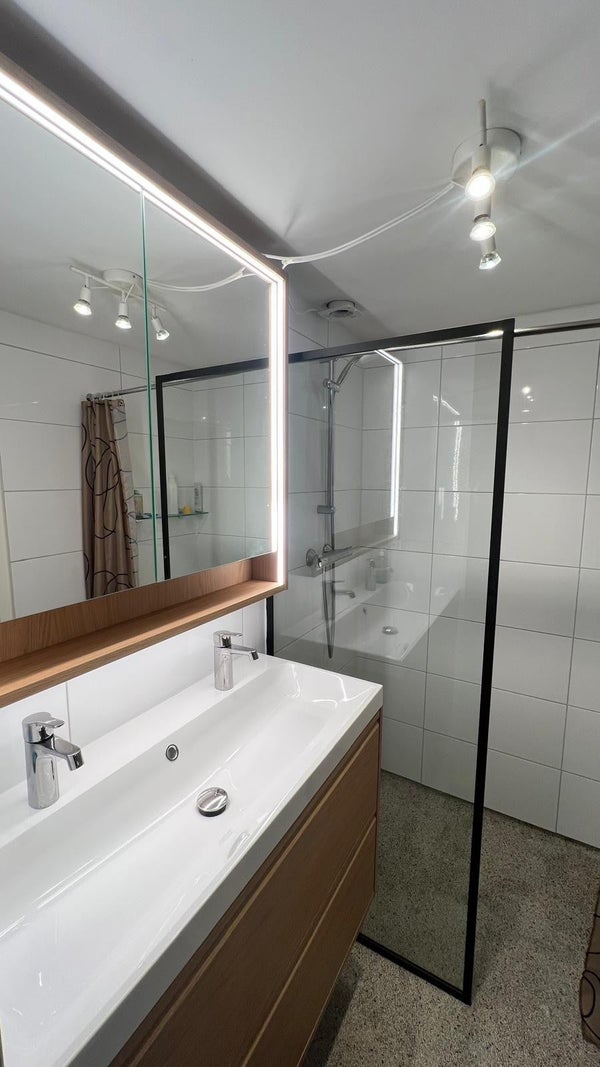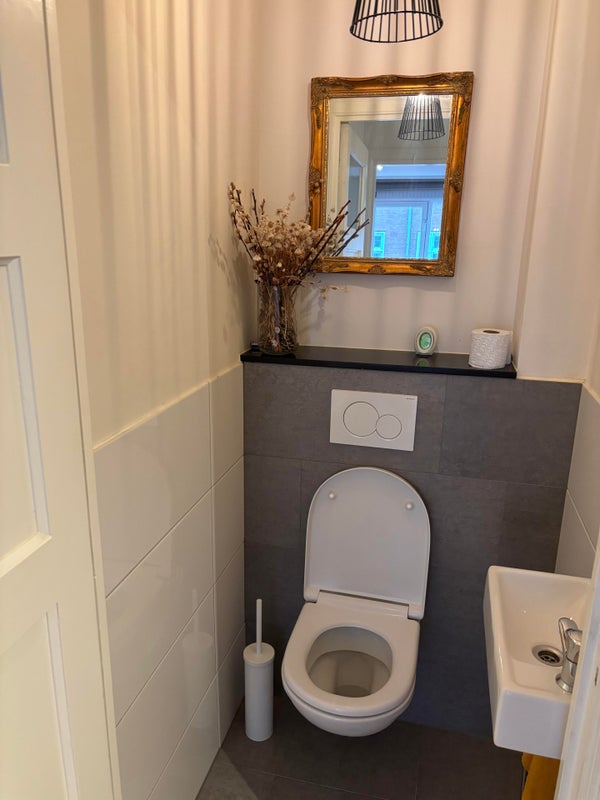 De moderne badkamer is voorzien van een inloopdouche, wastafel en ruimte voor een wasmachine en droger. Het separate toilet is bereikbaar vanuit de hal. In de hal bevinden zich daarnaast twee extra kasten, waardoor er geen gebrek is aan bergruimte. Op de bovenste verdieping van het hoofdgebouw is een extra berging van circa 19 m², die ook gebruikt kan worden als werkruimte. Deze beschikt bovendien over toegang tot een ruime vliering voor nog meer opslagruimte.