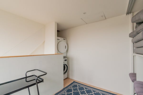 Tot slot de vijfde verdieping: een sfeervolle derde slaapkamer met handige pantry, aparte wasruimte en directe toegang tot het ruime dakterras van circa 22 m² – de perfecte plek voor een zomerse borrel of een rustig moment in de zon.