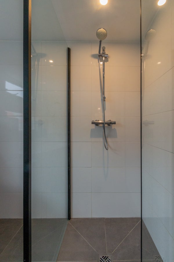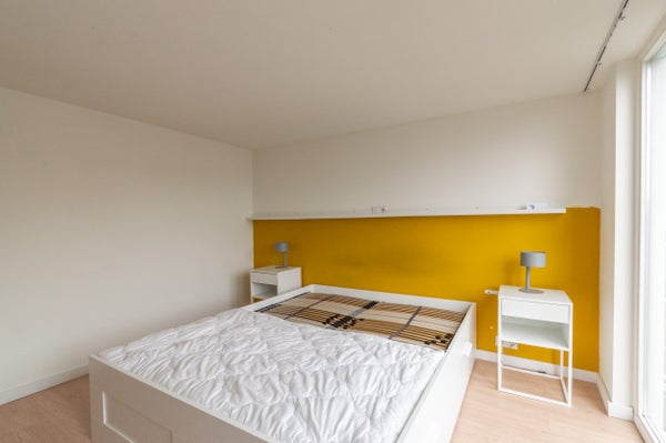 Een interne trap brengt je naar de vierde verdieping, waar een royale slaapkamer aan de voorzijde ligt – mét balkon. Deze verdieping is zowel intern bereikbaar als via het gemeenschappelijke trappenhuis, wat extra flexibiliteit en privacy biedt. Ideaal als eigen plek voor een (studerend) kind, gasten of juist als inspirerende werkruimte. Hier vind je ook een tweede, complete badkamer (2022) met ligbad, inloopdouche, toilet en wastafel.