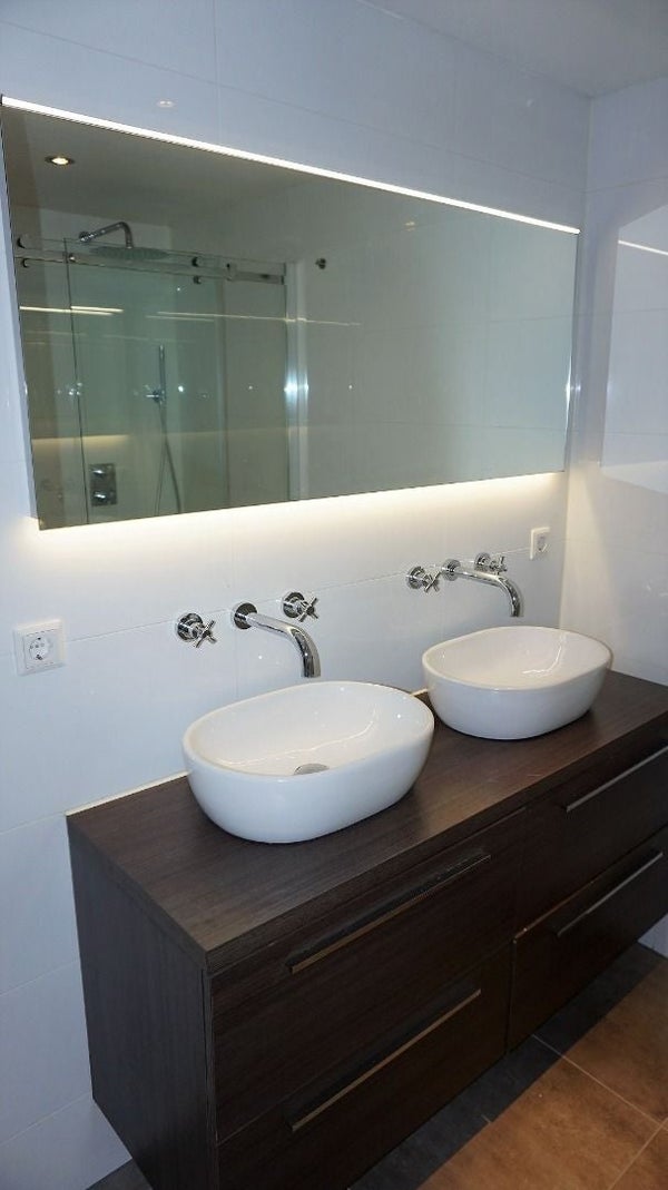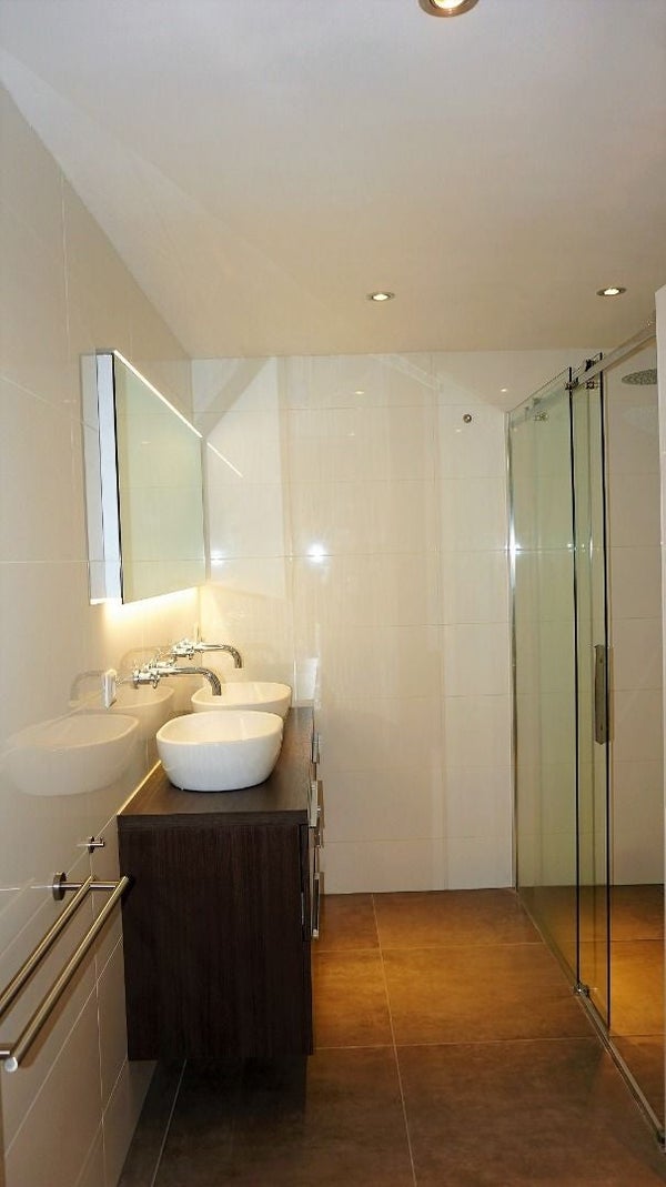 De moderne badkamer met his en hers wastafels en de riante douchehoek met dubbele stort douche.