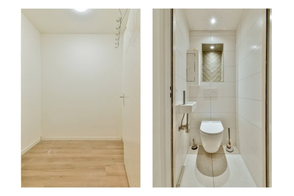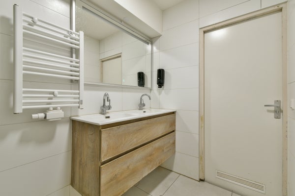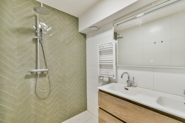 De badkamer is modern uitgevoerd en beschikt over een ruime inloopdouche, een dubbele wastafel en een stijlvolle afwerking in natuurlijke tinten. Het toilet bevindt zich apart van de badkamer en is eveneens netjes en modern ingericht met een ingebouwd kastje en een fonteintje.