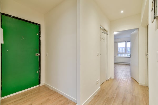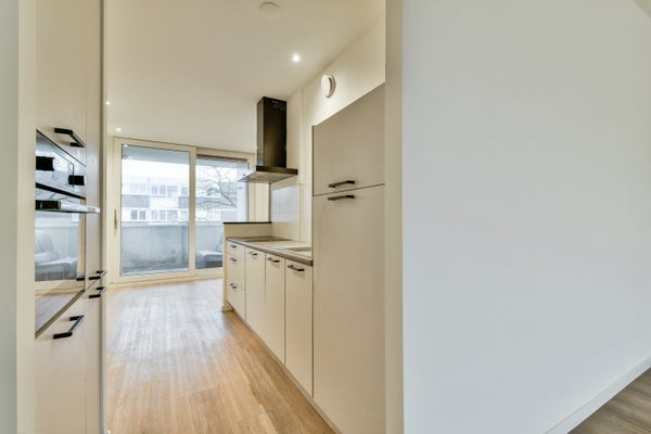 De woning heeft een praktische en verrassend ruime indeling die direct een gevoel van comfort en licht geeft. Bij binnenkomst leidt de hal je naar de verschillende kamers en vormt zo het centrale punt van het appartement. De woonkamer is royaal en voelt door de grote ramen open en uitnodigend aan. Aan deze ruimte grenst de open keuken, die strak is afgewerkt en voorzien is van de benodigde apparatuur. De keuken heeft een directe doorgang naar het balkon, waardoor koken en buiten genieten op een natuurlijke manier samenkomen.