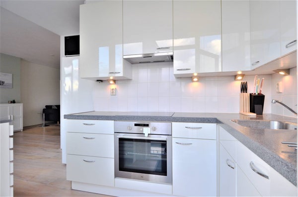 - Strakke open keuken aan de voorzijde, voorzien van complete inbouwapparatuur, met toegang tot het tweede balkon op het noorden met fraai uitzicht op de Zuidas.
