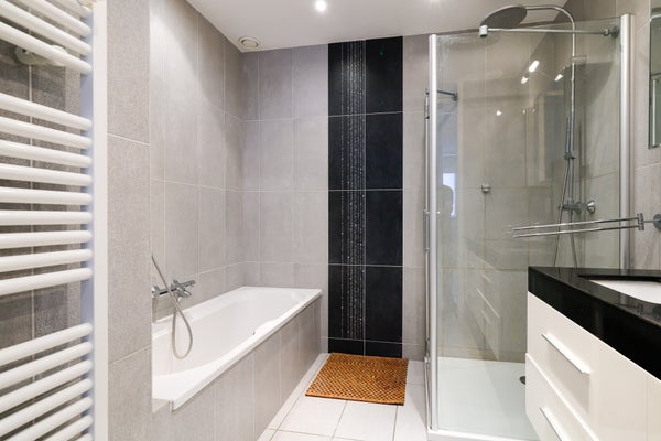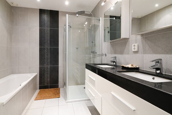 De badkamer ademt luxe en comfort, met een stijlvol design in neutrale tinten. U beschikt hier over zowel een ligbad als een aparte inloopdouche, ideaal om na een lange dag volledig te ontspannen. De dubbele wastafel met modern meubel maakt het geheel compleet en biedt veel gemak. Een separaat toilet bevindt zich apart van de badkamer, wat bijdraagt aan het praktische karakter van de woning.