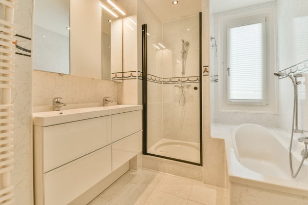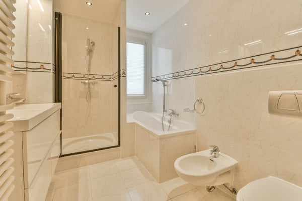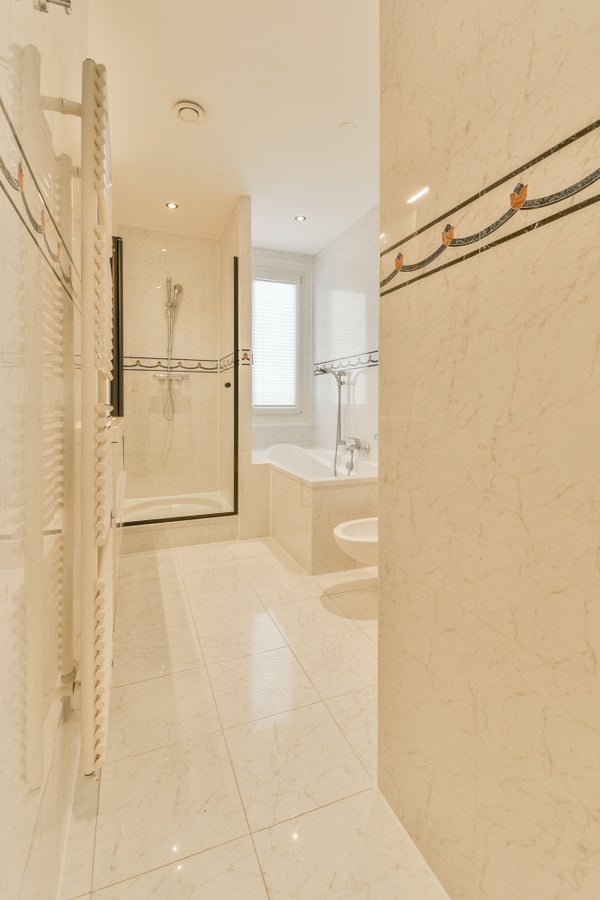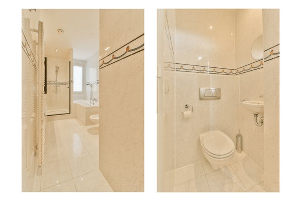 De badkamer is modern uitgevoerd en voorzien van een dubbele wastafel, een douche, een ligbad, een toilet en een bidet.