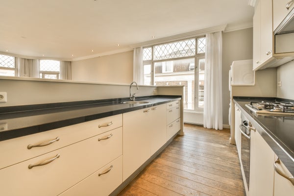 De royale woonkamer is bijzonder licht dankzij de hoekligging en de grote raampartijen en beschikt over een werkende gashaard. De open keuken met kookeiland is uitgerust met diverse inbouwapparatuur, waaronder een vaatwasser. In de keuken bevindt zich tevens een droger. Er is geen wasmachine aanwezig.