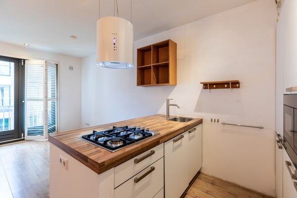 Via het gezamenlijke trappenhuis bereikt u de entree van het appartement op de derde verdieping. De lichte woonkamer met open keuken is aan de achterzijde gelegen en biedt toegang tot het balkon. De moderne keuken is voorzien van diverse inbouwapparatuur.