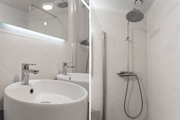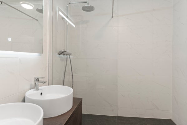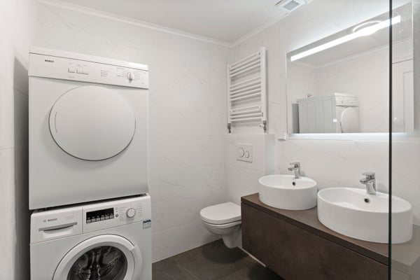 Verder zijn er twee slaapkamers en een badkamer voorzien van een ligbad met douche-opstelling, dubbele wastafel en een toilet. Ook is hier de aansluiting voor de wasmachine aanwezig.