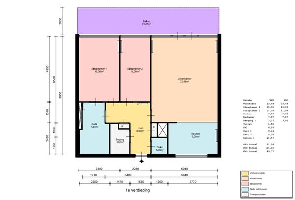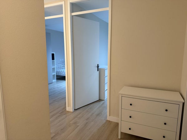 Gezamenlijke entree met trappenhuis. Hal met doorloop naar de slaapkamers, separaat toilet, badkamer, woonkamer met luxe open keuken (deze zal worden vervangen door een witte keuken). Externe berging.