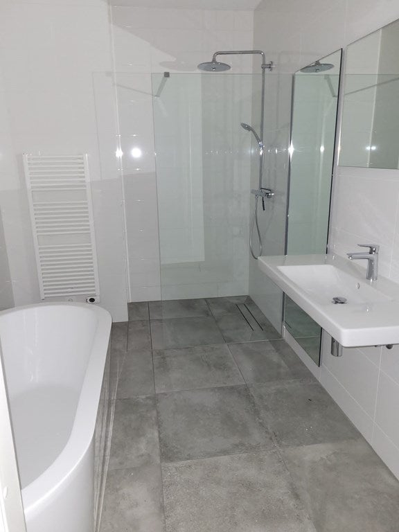 De badkamer is voorzien van een ligbad, aparte douche en wastafelmeubel.